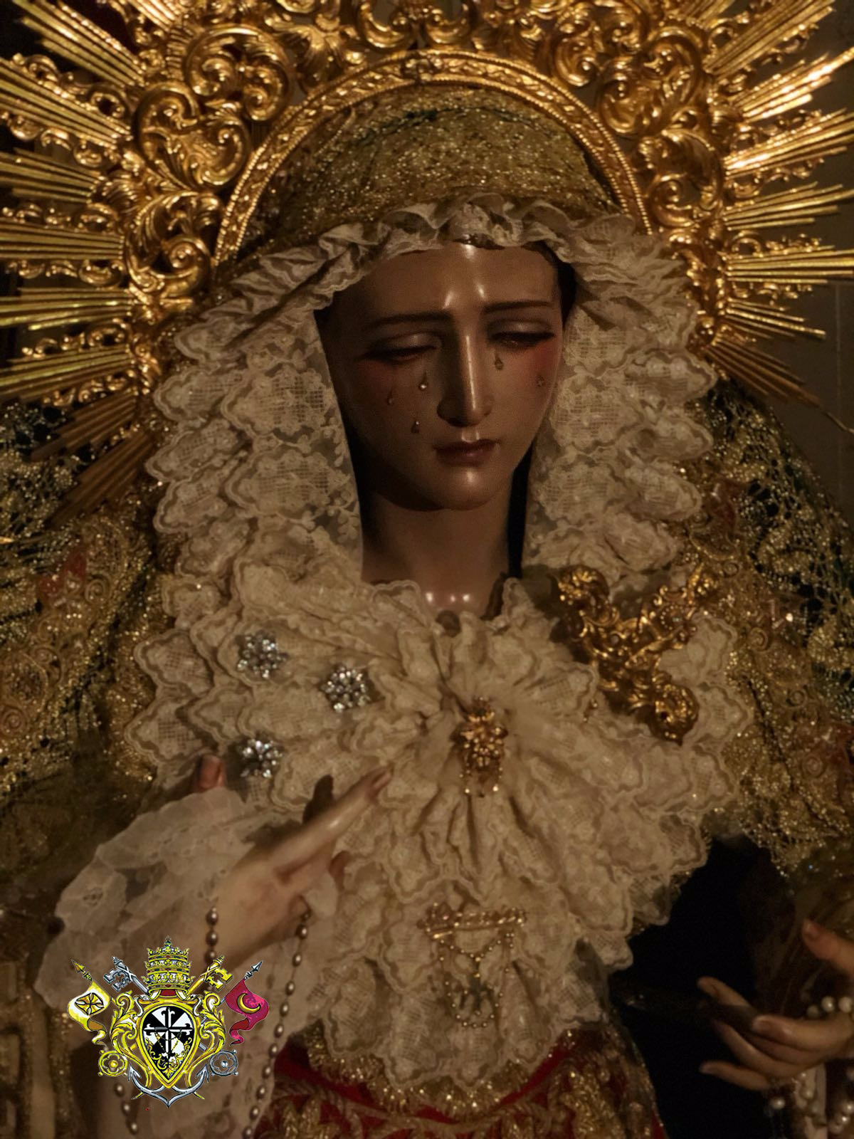Ya luce Nuestra Señora del Rosario en sus Misterios Dolorosos vestida para el tiempo ordinario, expuesta al culto de sus devotos en su capilla.