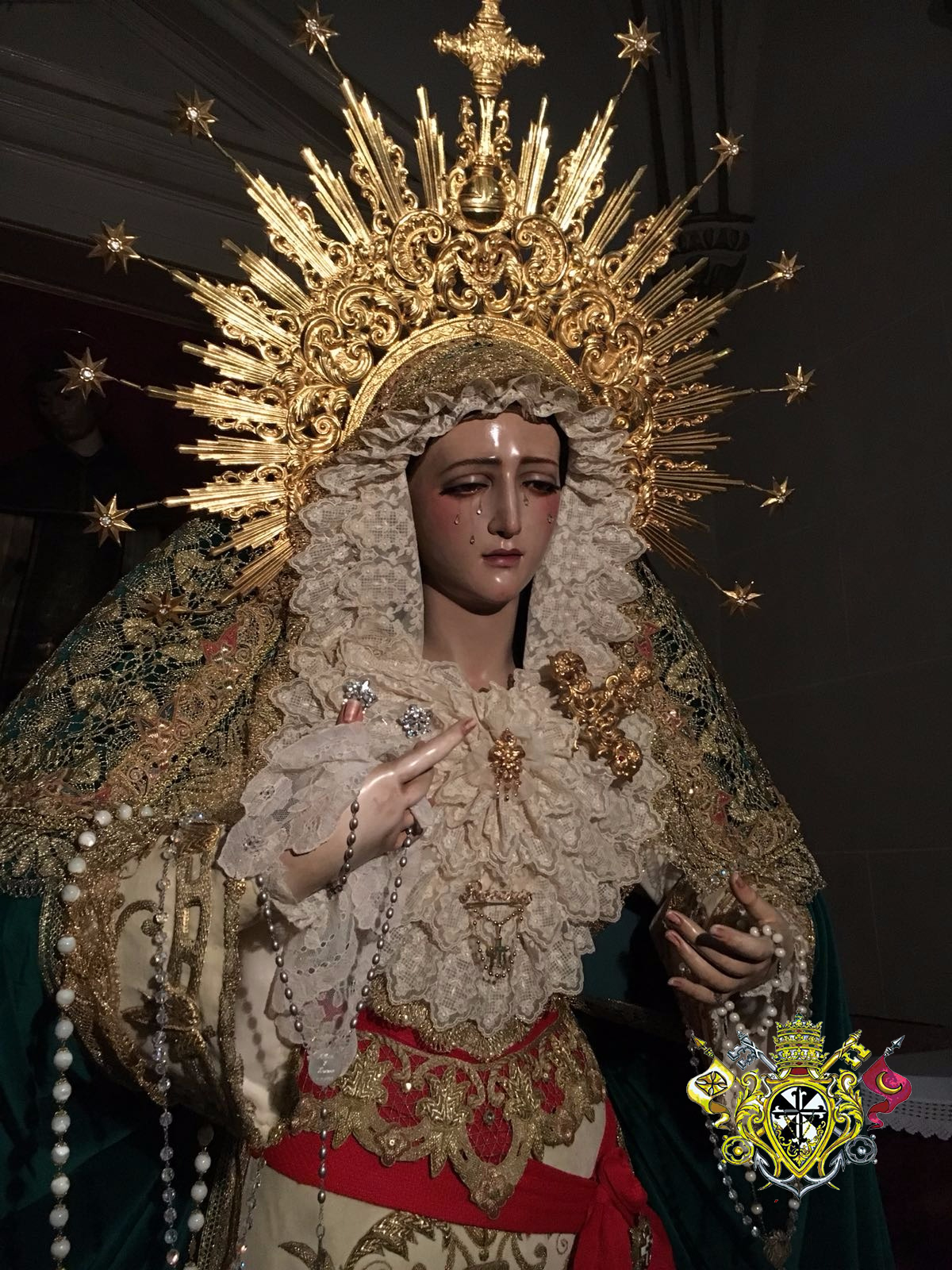 Vestida primorosamente a manos de su vestidor Álvaro Abril Vela, con tocado a blonda, manto verde , toca de sobre manto, saya blanca bordada en oro y diadema.